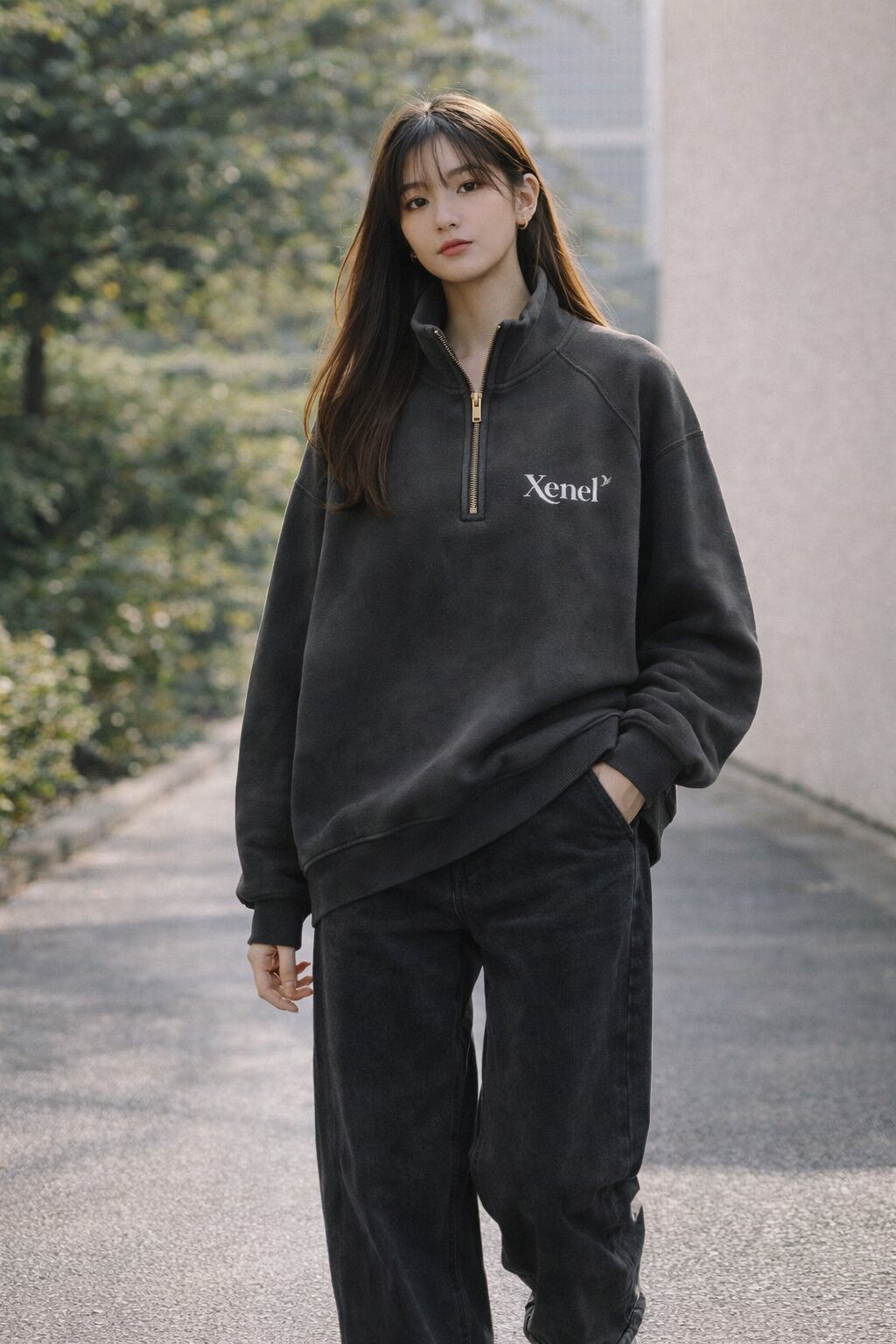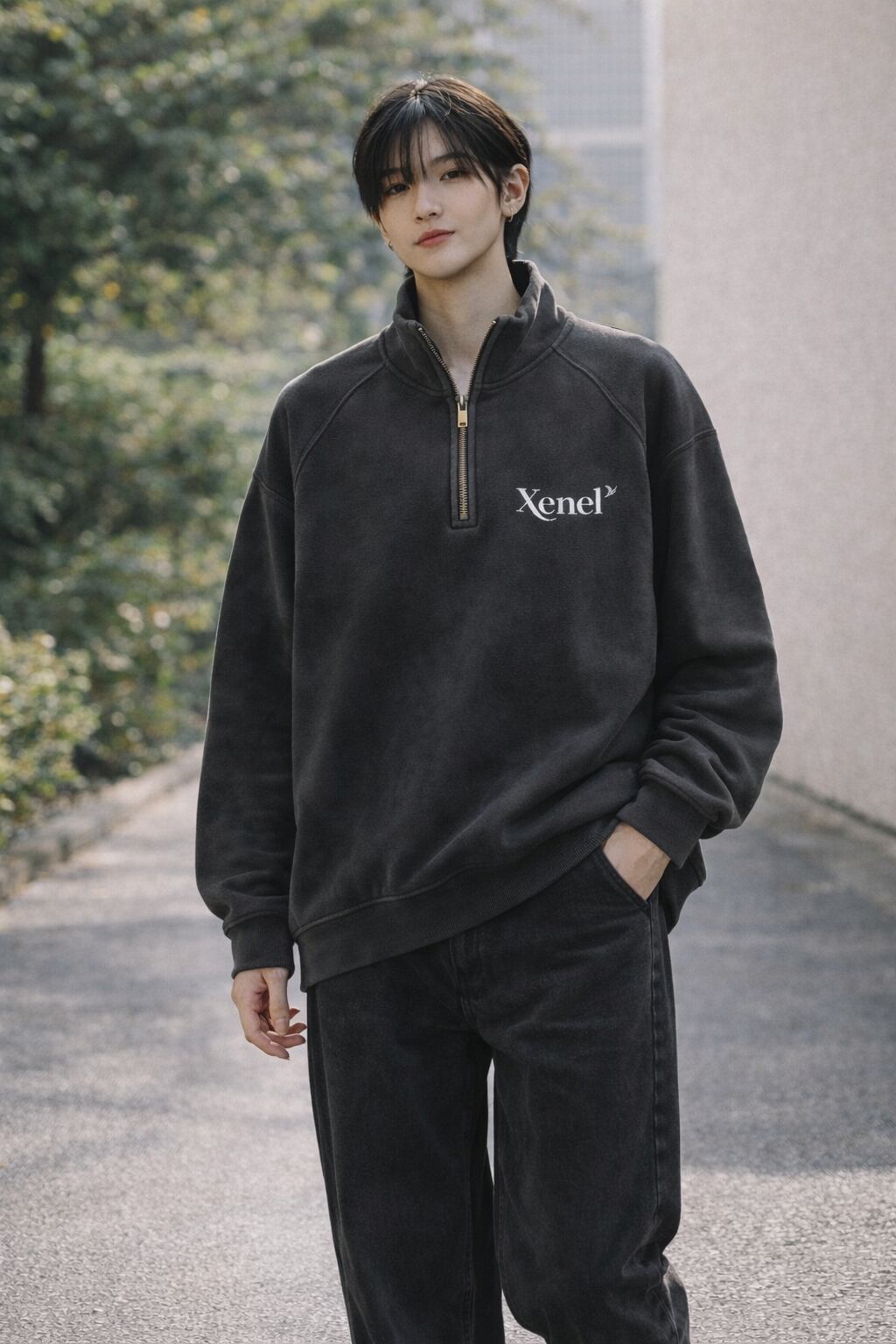裏起毛ウォッシュ加工ハーフジップスウェットプルオーバー/ブラック