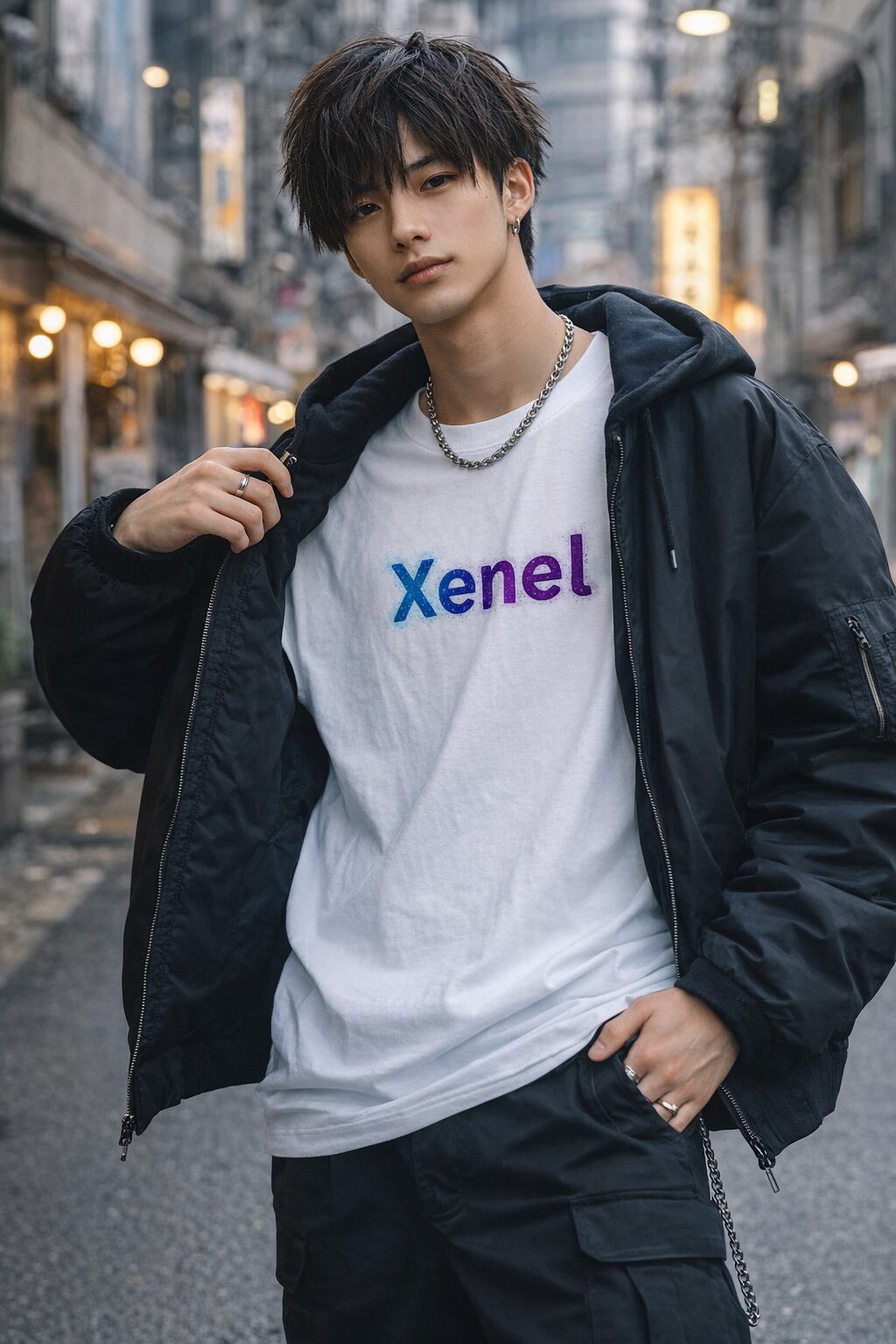 Xenelのロゴを正面に配置した、ミニマルなロングスリーブTシャツ。