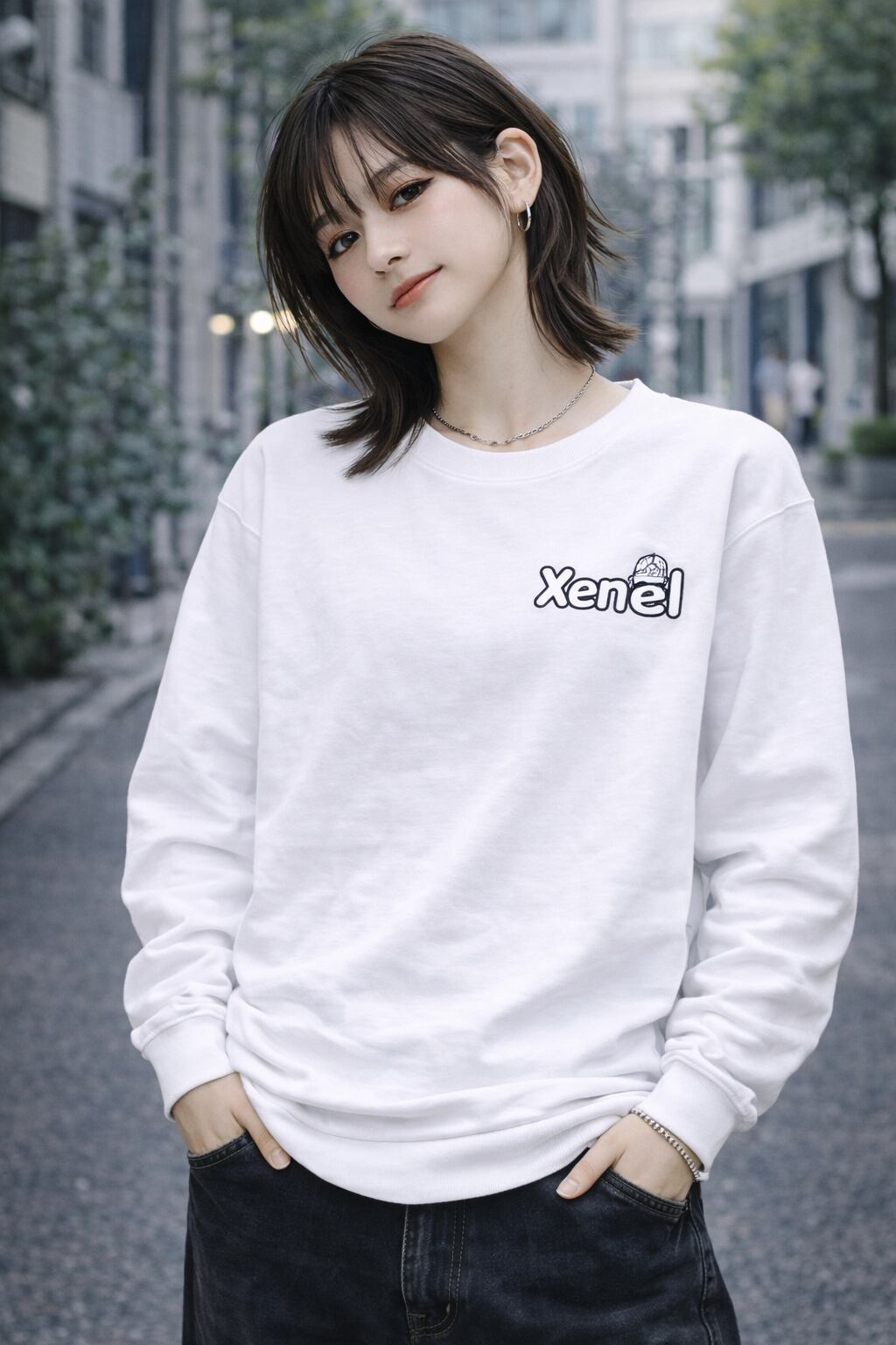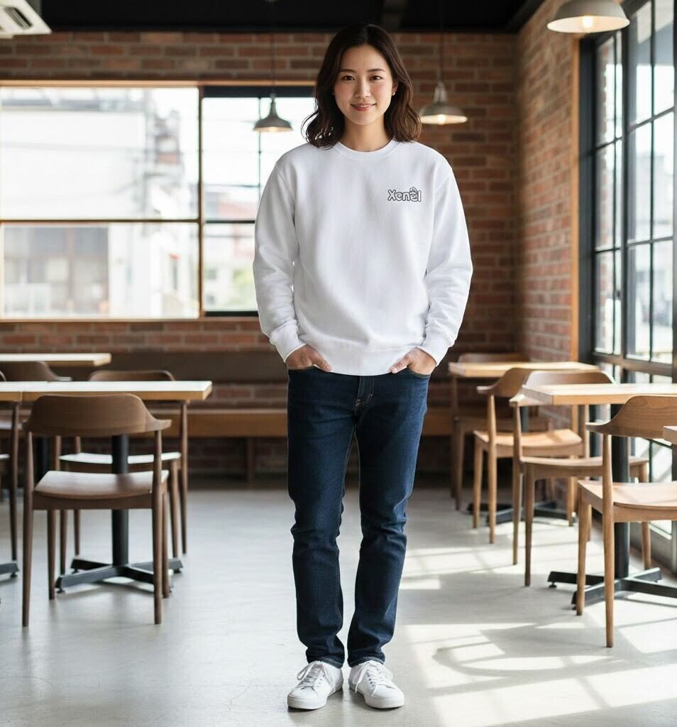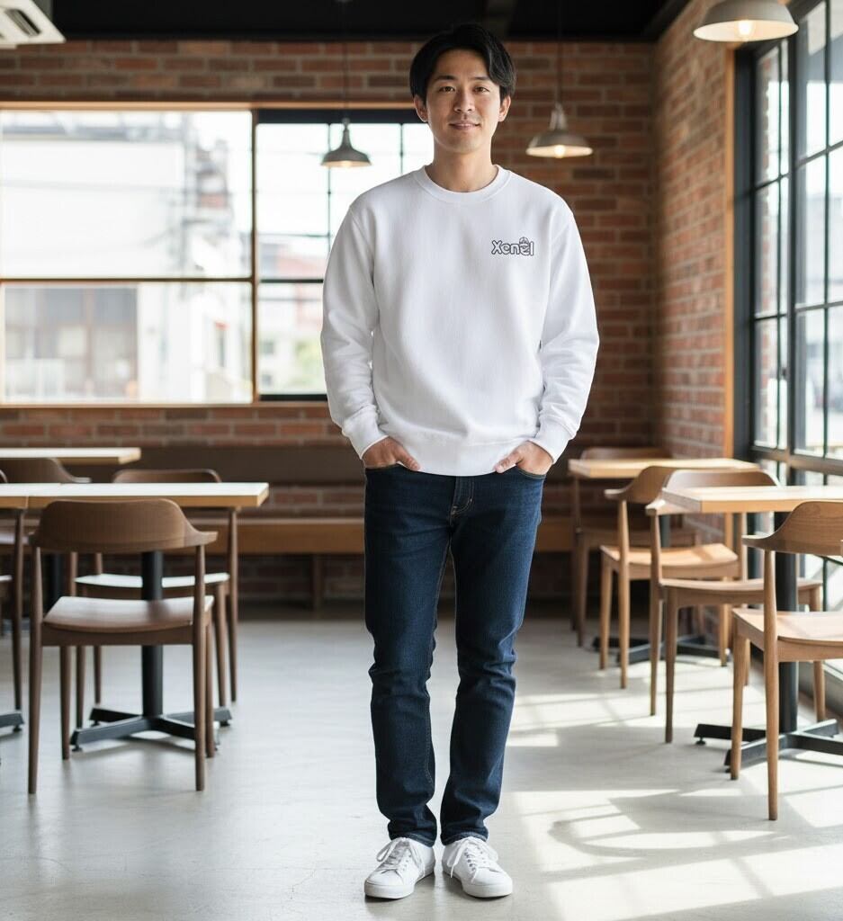 胸元に小さく配置された「Xenel」ロゴが特徴のクルーネックスウェット。