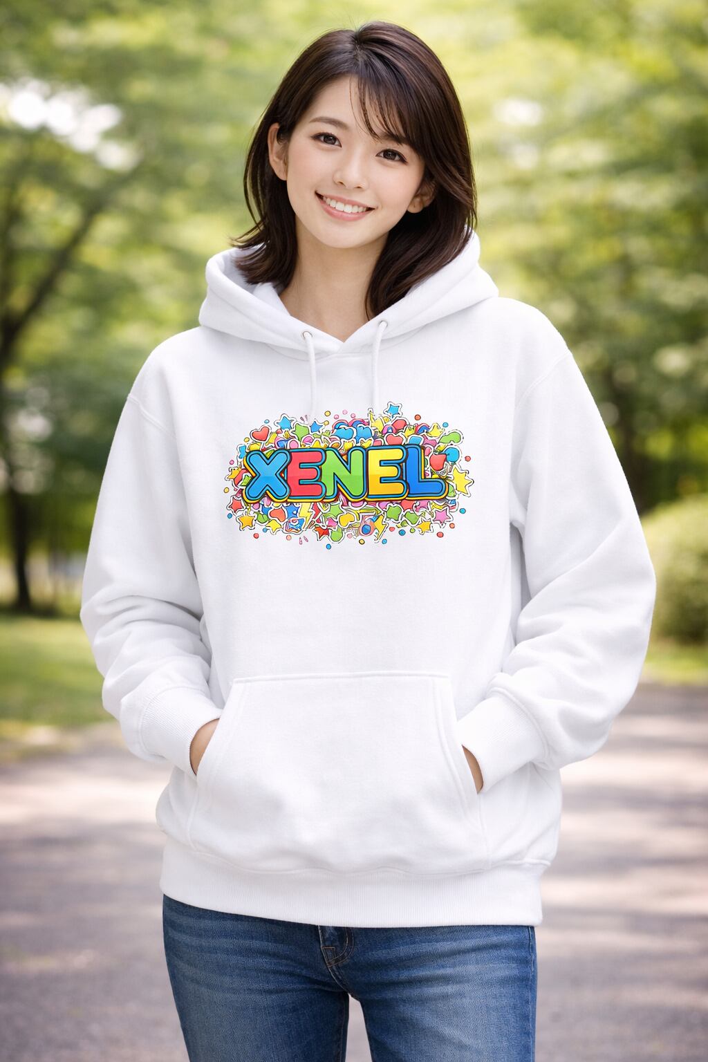 カラフルなモチーフが弾けるように広がる、遊び心あふれるXenelのロゴフーディ。