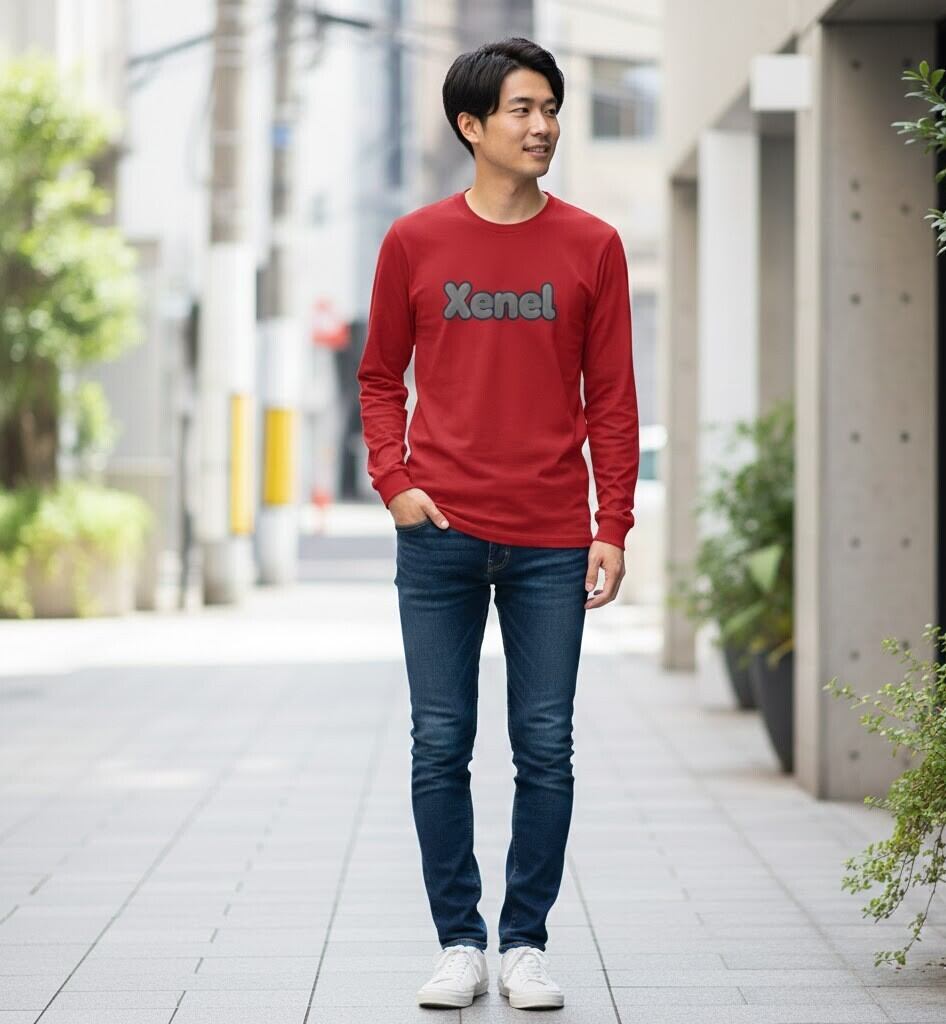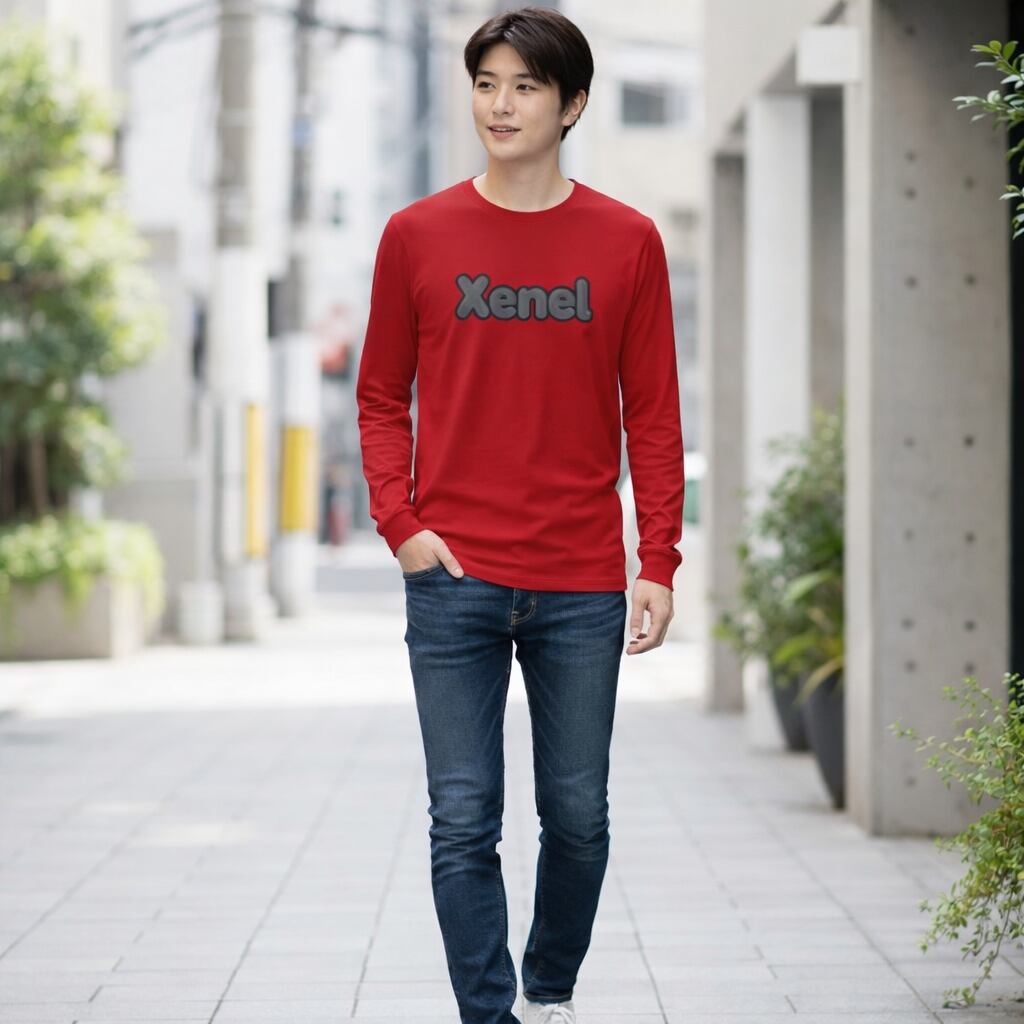 鮮烈なレッドに浮かび上がるXenelロゴが、視線を一瞬で奪うロングスリーブTシャツ。