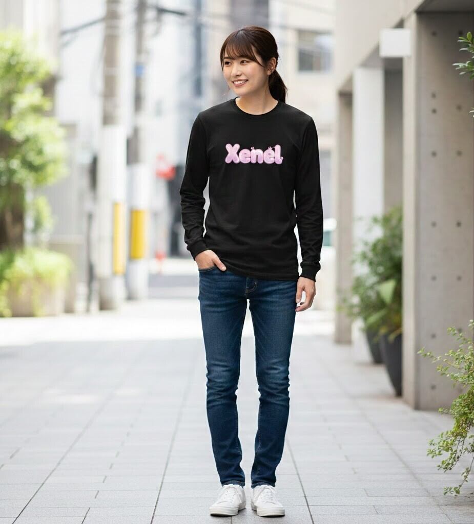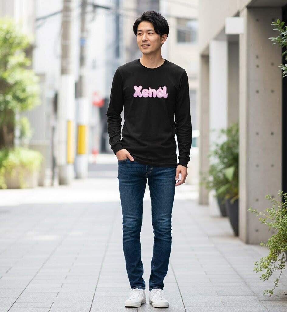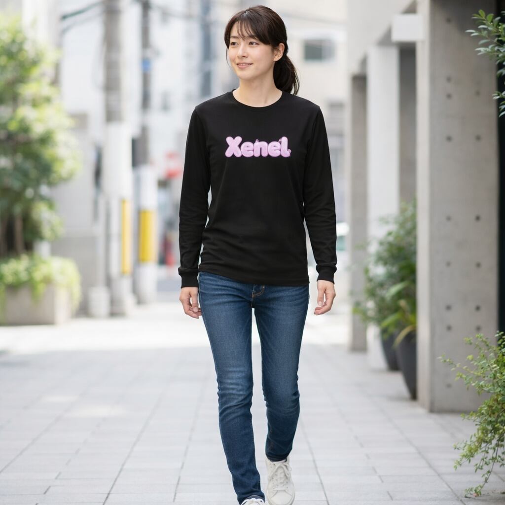 ピンクの「Xenel」ロゴが、ブラックボディに映えるロングスリーブTシャツ。