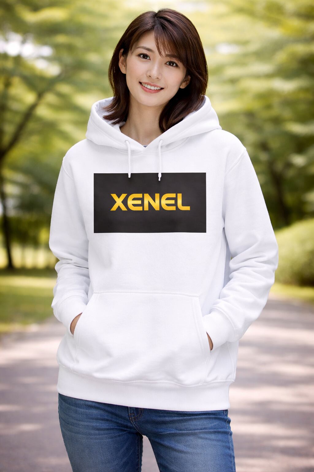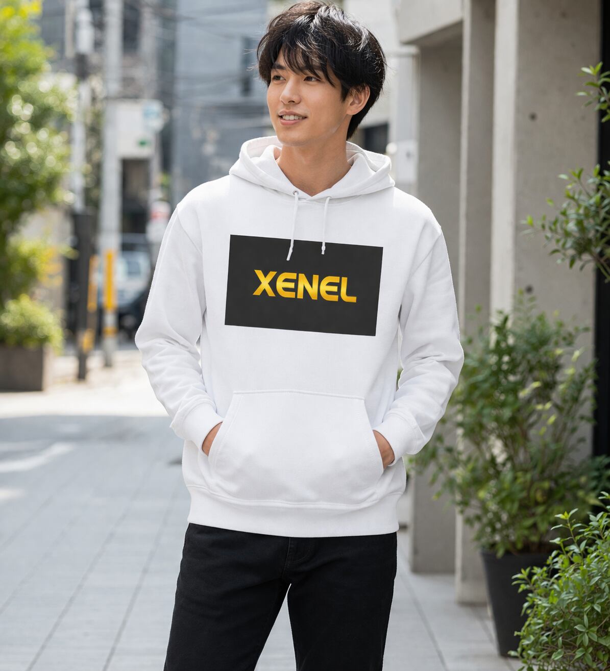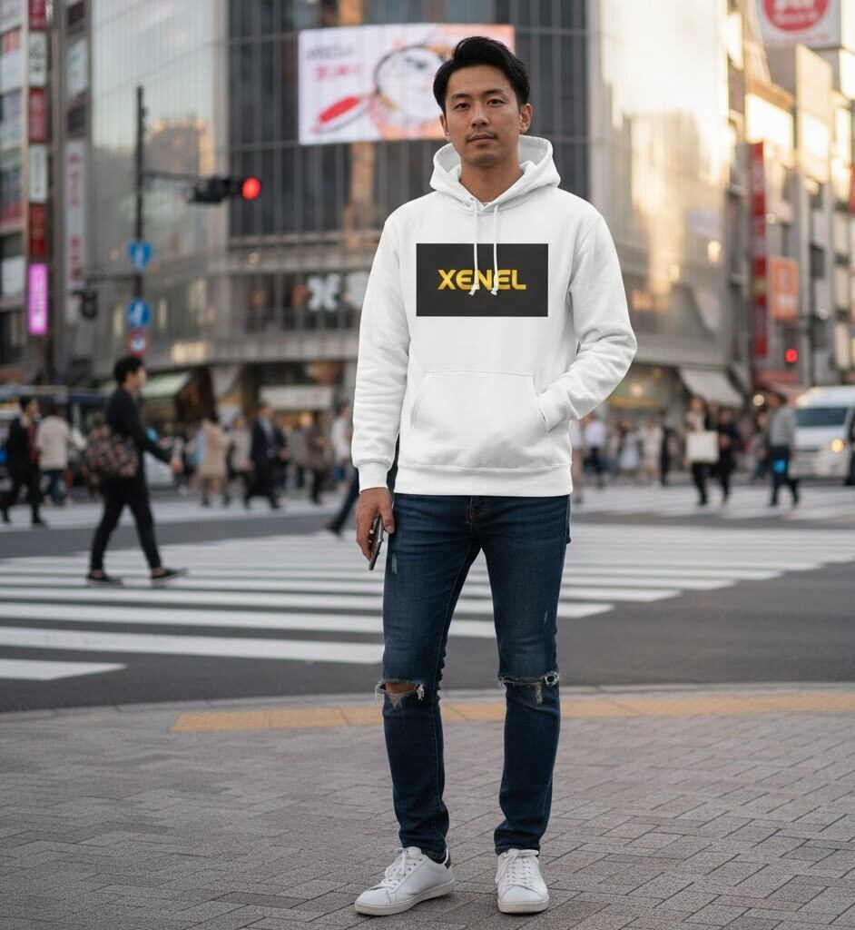 深い黒のスクエアに、静かに輝くゴールドの「XENEL」ロゴを配したアイコンフーディ。