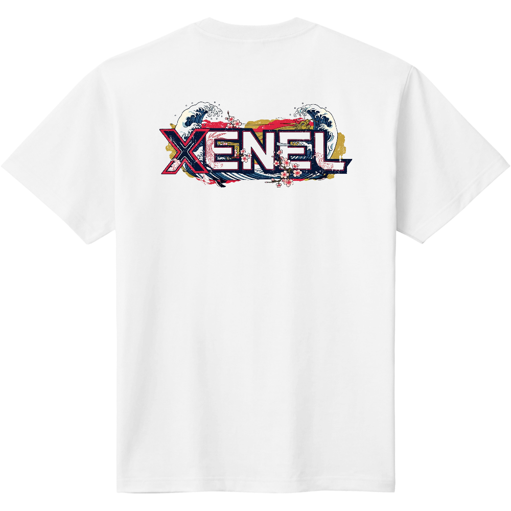 荒波と舞い散る桜を背景に、存在感のある「XENEL」ロゴを大胆にデザイン。