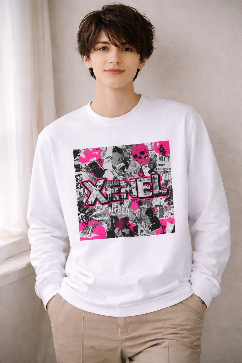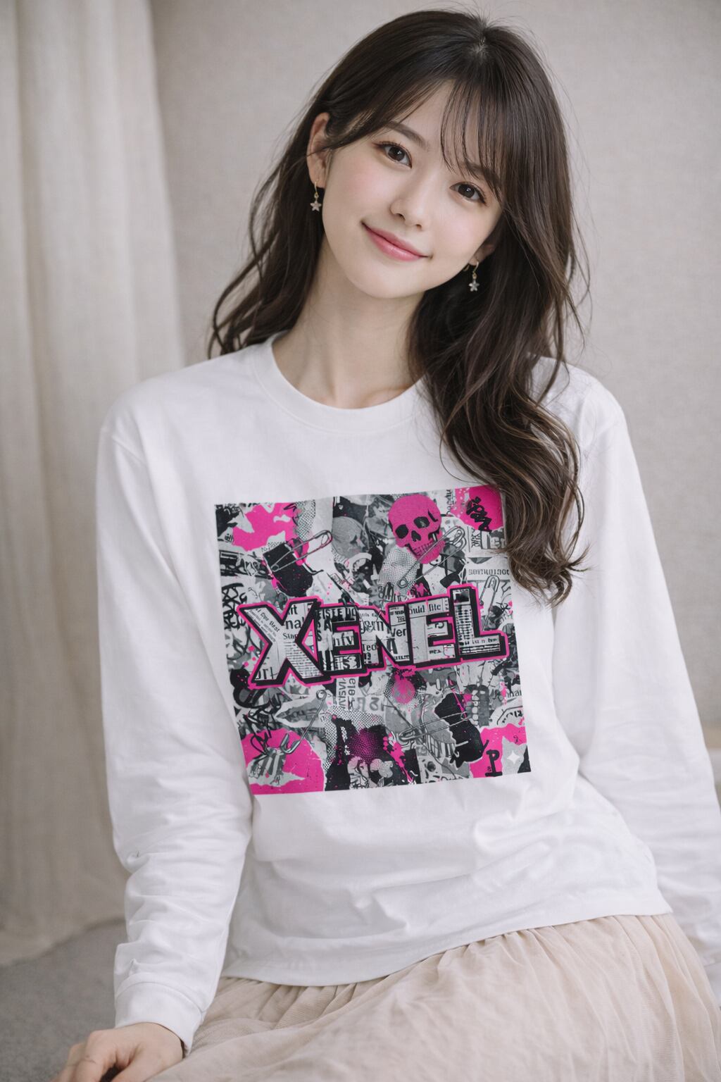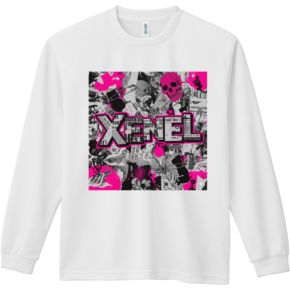 モノクロのコラージュグラフィックに、ネオンピンクのアクセントを大胆に重ねたストリート仕様のロングスリーブTシャツ。