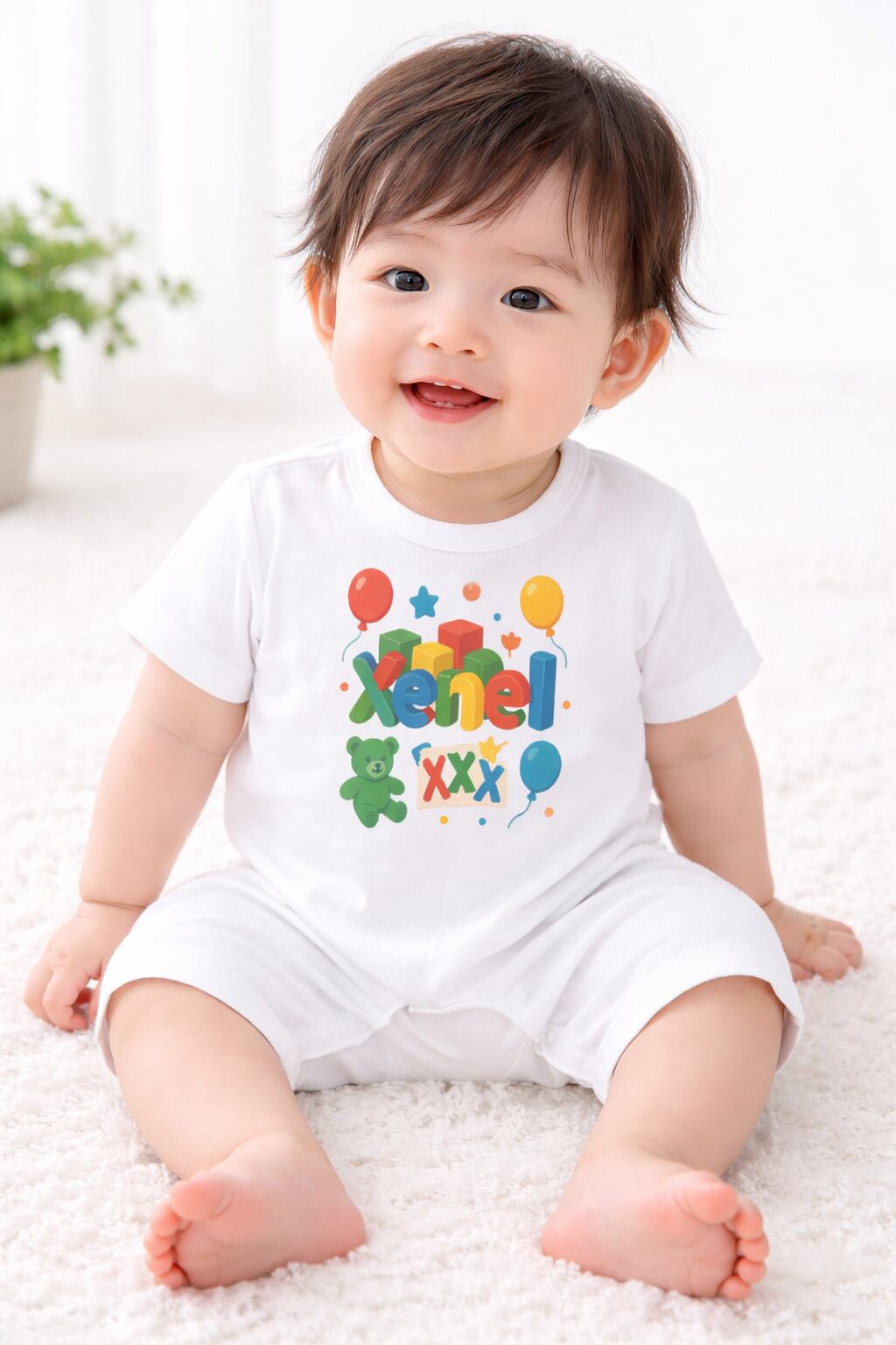カラフルなバルーンと立体感のあるロゴが目を引く、ポップでやさしいベビーロンパース。