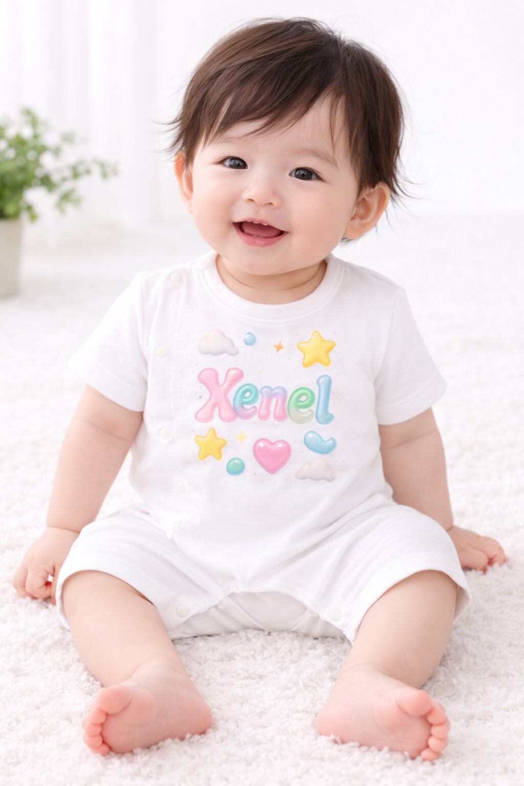 赤ちゃんのやわらかな雰囲気にぴったりな、やさしく愛らしいロンパースです。