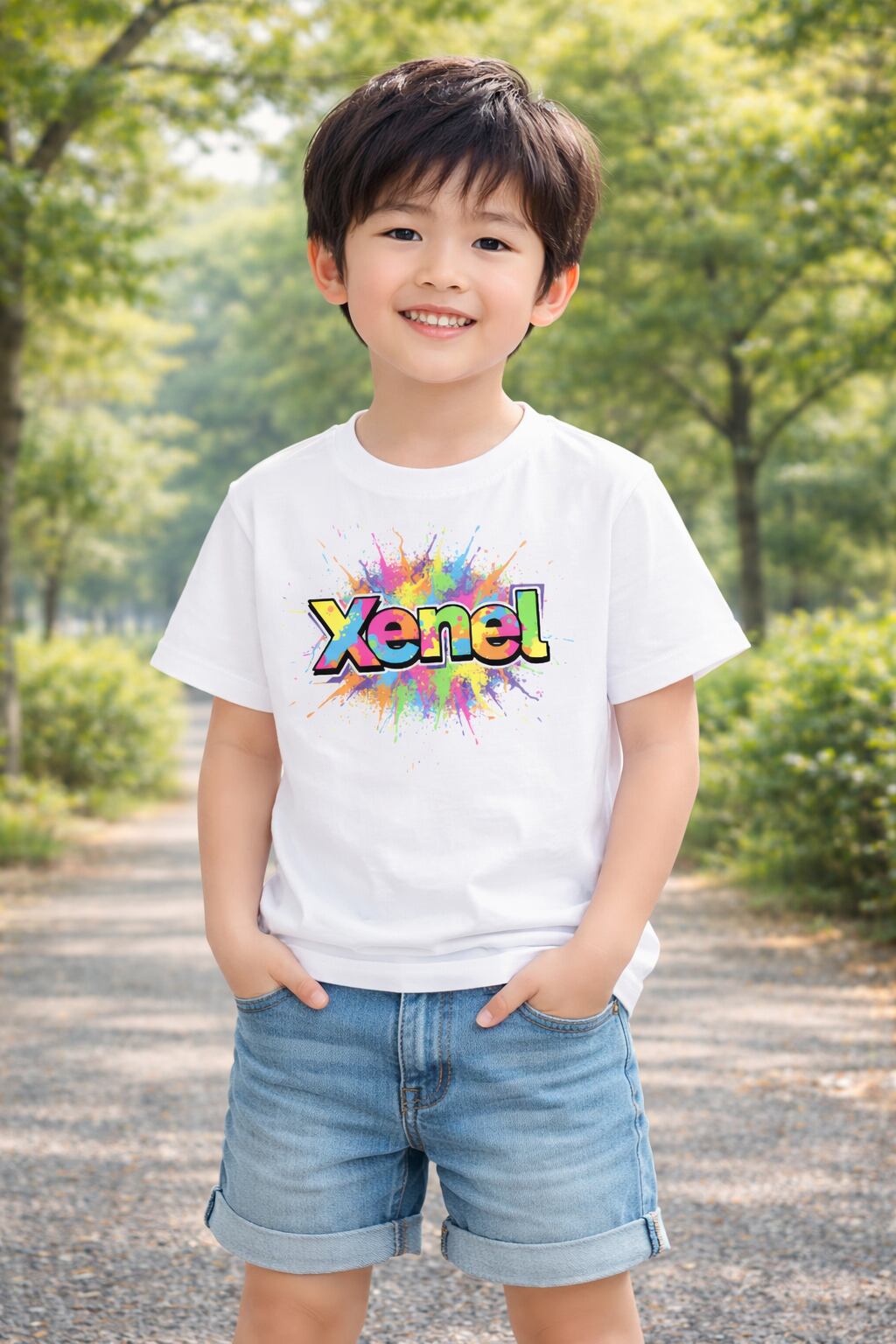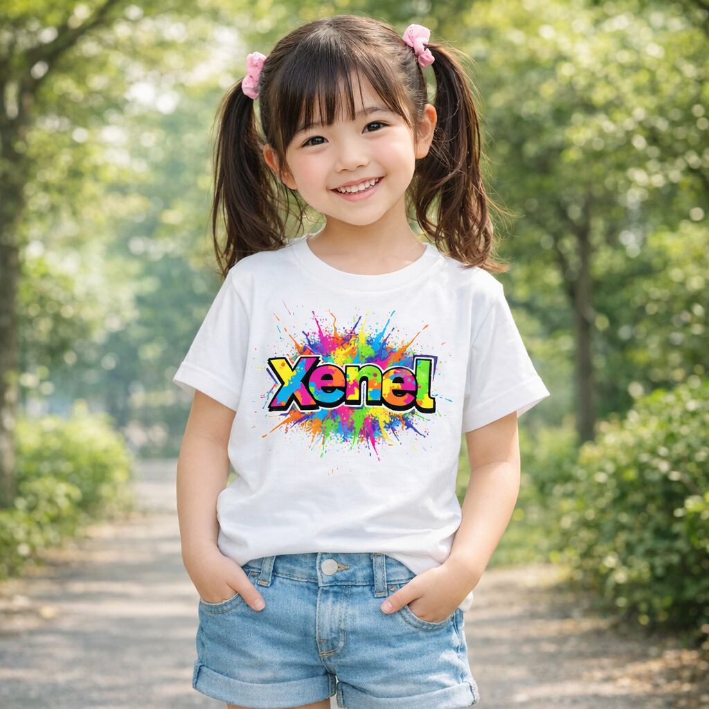 カラフルなペイントスプラッシュとポップなXenelロゴが弾ける、インパクト抜群のキッズTシャツ。