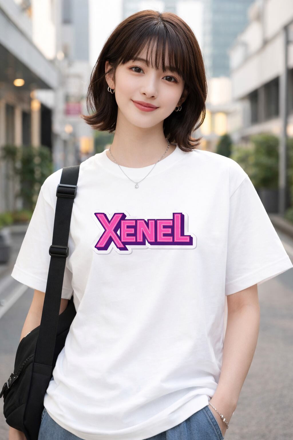 ネオンピンクのロゴが、コーデの中で自然に主張する。